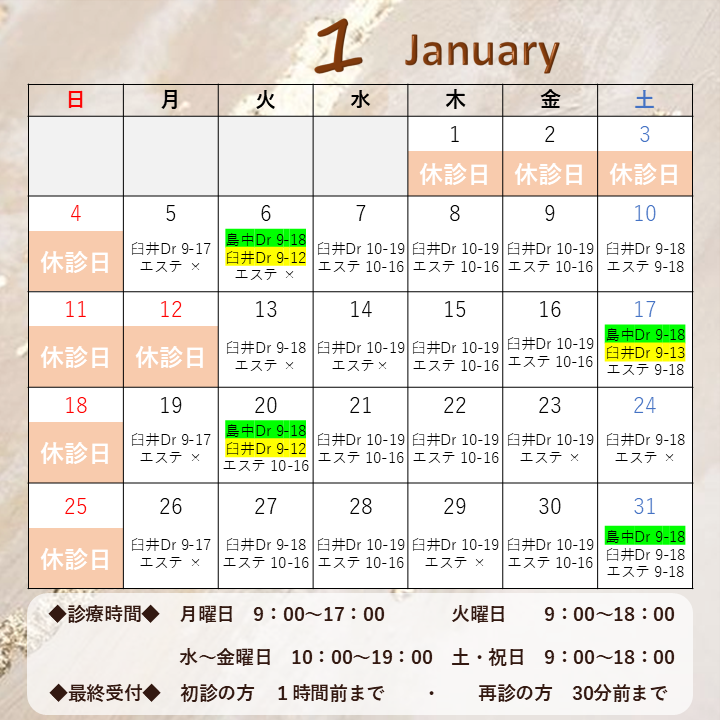 2026年1月より、火曜日と土曜日の診療体制が変更しております。 特に、島中医師の診療をご希望の方はご留意をいただきますよう よろしくお願いいたします。 詳細は、下記をご確認ください。 ☆診療時間表 2026.1改...