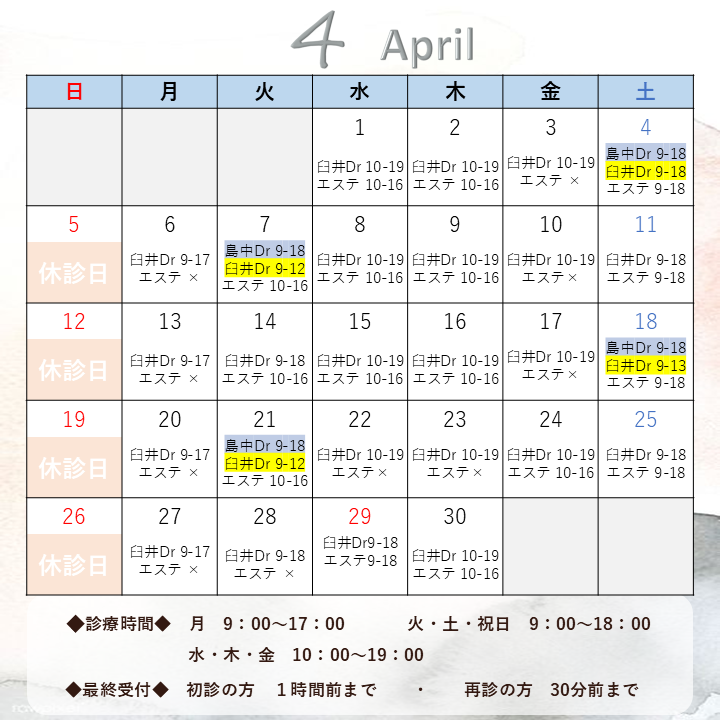 🌸4月の診療カレンダー🌷